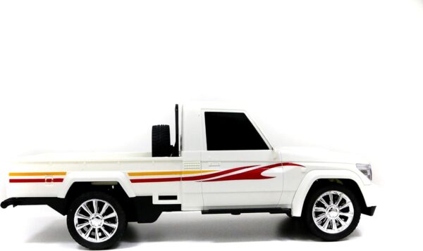 Bring the thrill of off-road adventure home with this high-performance 1:12 scale remote-controlled pickup truck. Modeled after the iconic Toyota Land Cruiser Shas, this white desert-king vehicle features a rugged design complete with stylish flame decals and a functional cargo bed. Designed for durability and realistic play, it offers full-function steering and interactive features that make it the ultimate gift for young motoring enthusiasts.