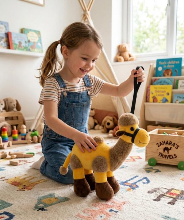 Bring a touch of desert magic to your child’s playroom with this vibrant Yellow Camel Plush Toy. Designed with both play and comfort in mind, this charming stuffed animal features a striking bright yellow body complemented by ultra-soft brown plush humps and feet.