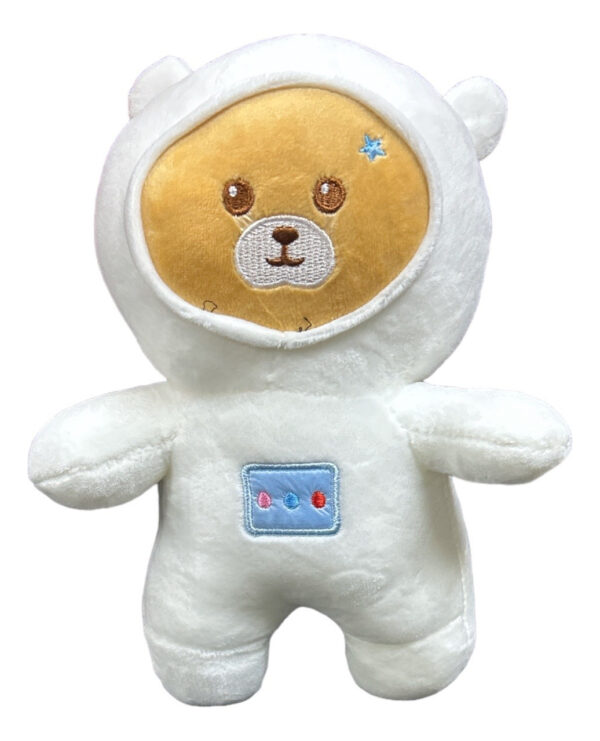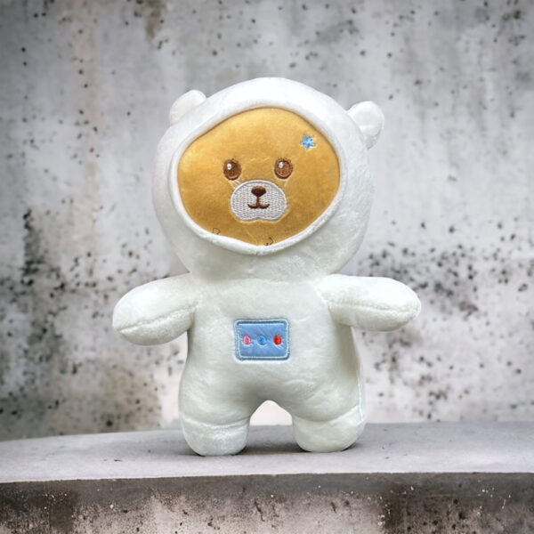 - Design Features: The bear’s face is visible through the helmet’s opening, which sometimes features a small star or planet embroidery. The suit includes a small embroidered control panel on the chest.