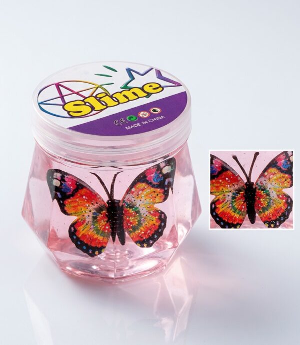 - Design: Features a butterfly figurine suspended inside clear or lightly colored jelly-like slime, typically housed in a diamond-shaped or hexagonal transparent bottle.