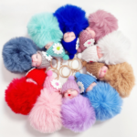 Adorable sleeping doll keychains featuring soft plush pom-poms in a variety of vibrant colors. Each keychain features a sweet sleeping doll wearing a knitted hat decorated with a delicate daisy flower, attached to a fluffy faux fur pom-pom.