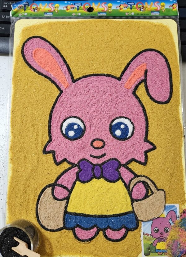 - Complete Creative Set: Each kit features a high-quality, pre-printed rabbit design card and a palette of 8 vibrant sand colors (White, Green, Orange, Yellow, Black, Pink, Blue, and Sky Blue) to bring the character to life.