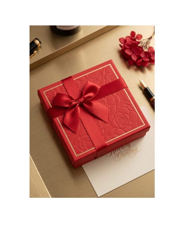 Decorative Accents: box is finished with a matching red satin ribbon tied into a classic bow. A delicate gold foil border on the lid provides a refined contrast against the deep red.