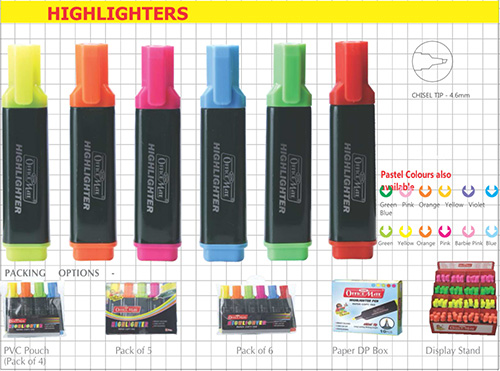 Available Highlighters Bright fluorescent colours Non-toxic ink Smooth marking Ideal for plain papers, fax Sheet Non-fading ink 3 Years shelf life