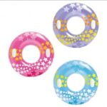 Key features Design: features a clear top section bedazzled with a “Stellar matrix” of bright star patterns and a solid-colored opaque bottom. Stability: equipped with two heavy-duty grab handles on the sides to provide a secure grip and extra stability while floating. Material: constructed from durable 9ga (0.23mm) vinyl (polyvinyl chloride), making it resistant to standard wear and tear in water. Colors: typically available in assorted colors including blue, pink, and purple. Portability: lightweight and compact when deflated, making it ideal for travel and easy storage.