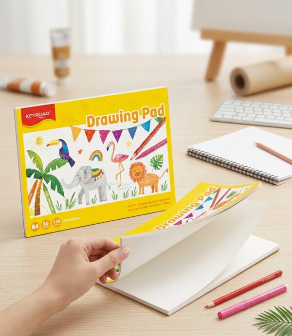 - A4-sized drawing pad containing 16 sheets, each with a weight of 120gsm. Suitable for use with coloring pencil, wax canyon, fiber marker pen, and stamp.