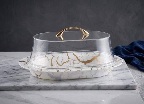 Design: A contemporary Nordic-inspired marble texture with metallic gold accents. The lid features a matching gold-finished handle for a premium touch.
