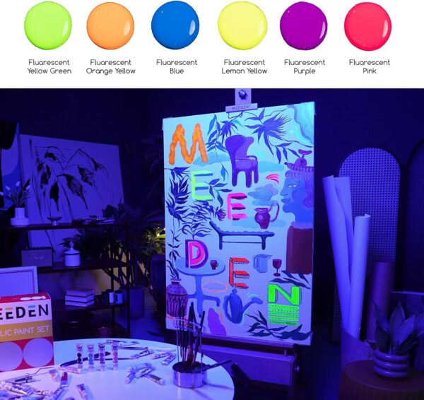 - High Quality Pigments: MEEDEN Fluid Fluorescent Acrylic Paints are designed for artists who need low viscosity paints. Has good dispersion, high tinting strength, flexibility and good adhesion. Never fade. Let your artwork be preserved for a long time. Available for artists, adults and beginners of all ages. Premium pigments are only for presenting the best artwork
