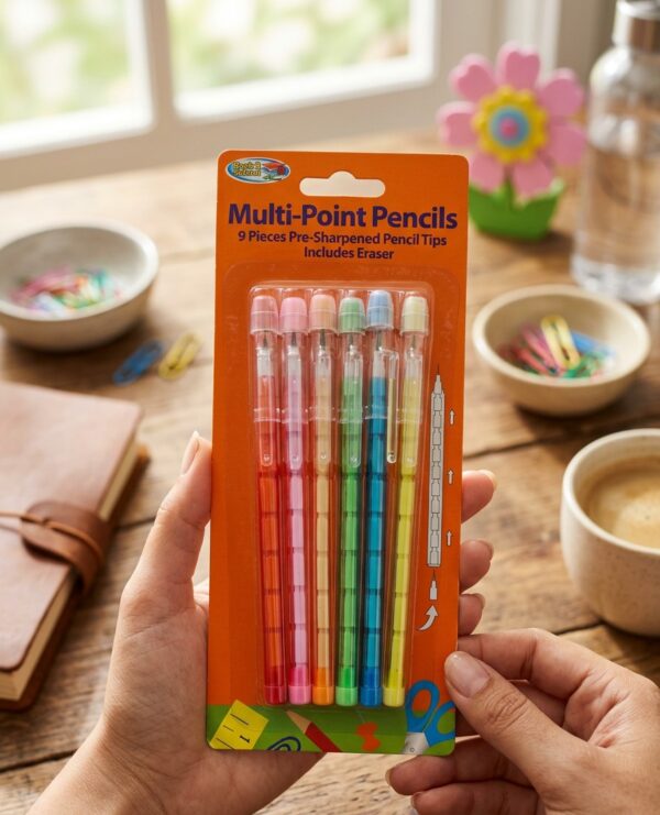 Upgrade your writing experience with our 9-Pack Multi-Point Pencils, the ultimate mess-free solution for school, home, or the office. Designed for those who hate the hassle of sharpeners, these “stackable” pencils feature multiple pre-sharpened graphite nibs housed in a durable, translucent body. When a tip becomes dull, simply pull it out from the front and push it into the back to reveal a fresh, sharp point instantly.