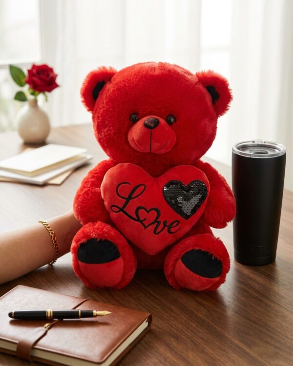 - Interactive Sequin Heart: The bear holds a soft plush heart featuring reversible sequins that shift colors when swiped, surrounding a stylishly embroidered “Love” message.