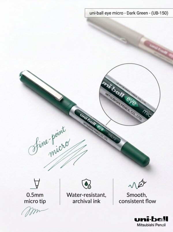 Uni-Ball Eye Micro 0.5mm Liquid Ink Pen – Vibrant Dark Green – Waterproof & Fade-Proof